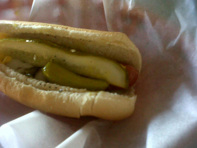 I just returned from nearly a week spent in Long Beach with my bestie, braving ice-cold winds and hearing tales of snow and hail from home. The trip was jam-packed with gabbing, girl talk, nail painting, eating, drinking, shopping (and can I say, no sleep?). Besides the quality time I've been missing, we discovered an amazing hot dog place called Mustard's Chicago Hot Dogs. I'm sorry I only have this cell phone picture, but here are some more descriptors: tangy relish, tart dill pickle, tomato wedge, celery salt., pepper, onion, mustard. That's right, TWO KINDS of pickle accessory. I was in pickle heaven. We went two days in a row, and I'm already craving another one.